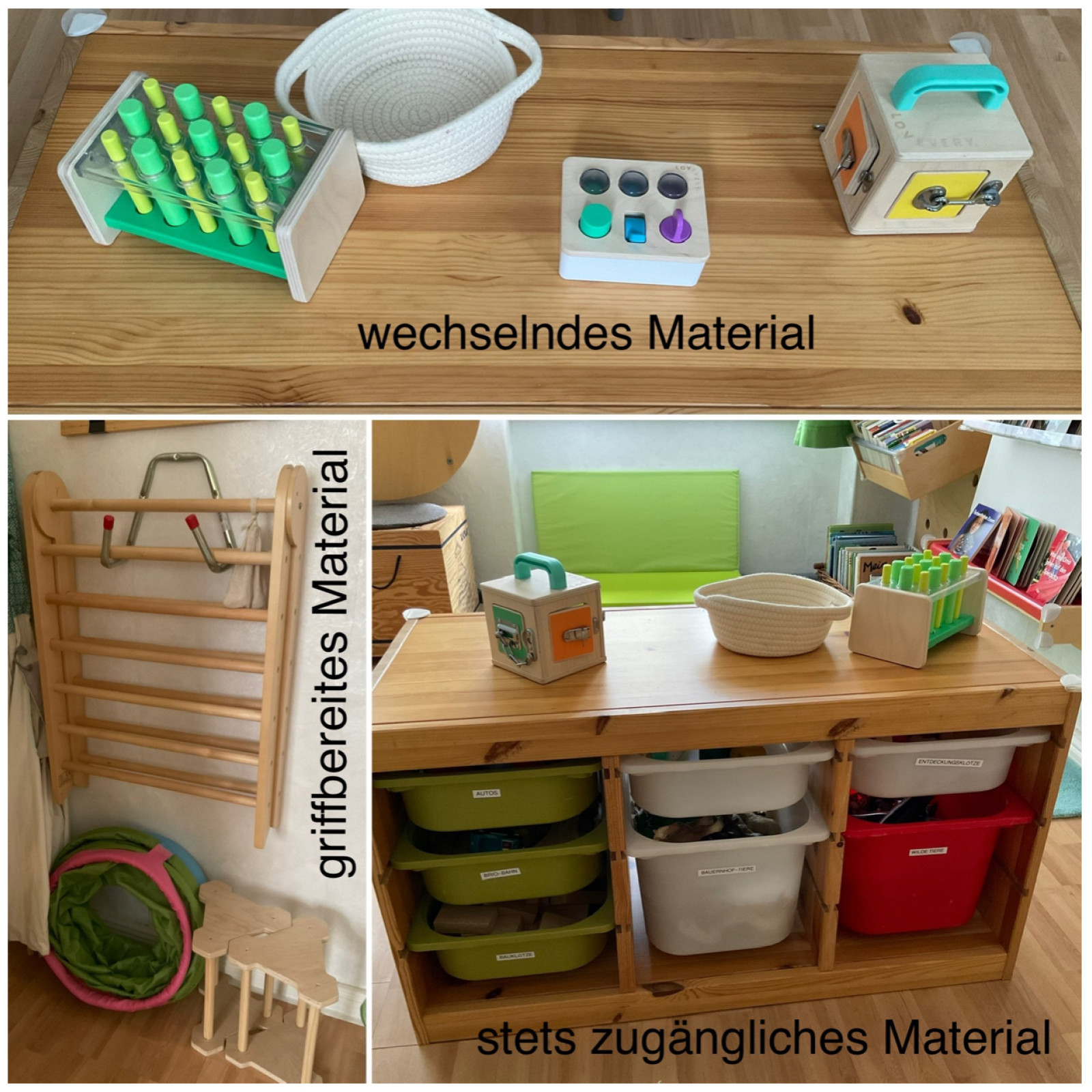Ich überprüfe immer wieder, ob das Spielzimmer den Bedürfnissen der Kinder gerecht wird und ob das Angebot den derzeitigen Entwicklungsthemen oder Interessen entspricht. Gleichzeitig bin ich bestrebt, dass das Kinderzimmer übersichtlich bleibt, damit die Kinder sich darin gut zurecht finden. Deswegen tausche ich regelmäßig Spielmaterial aus oder räume um.