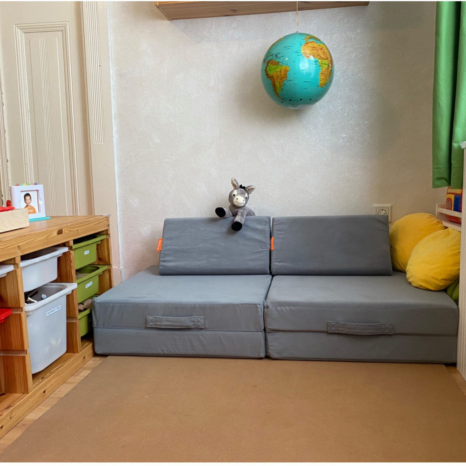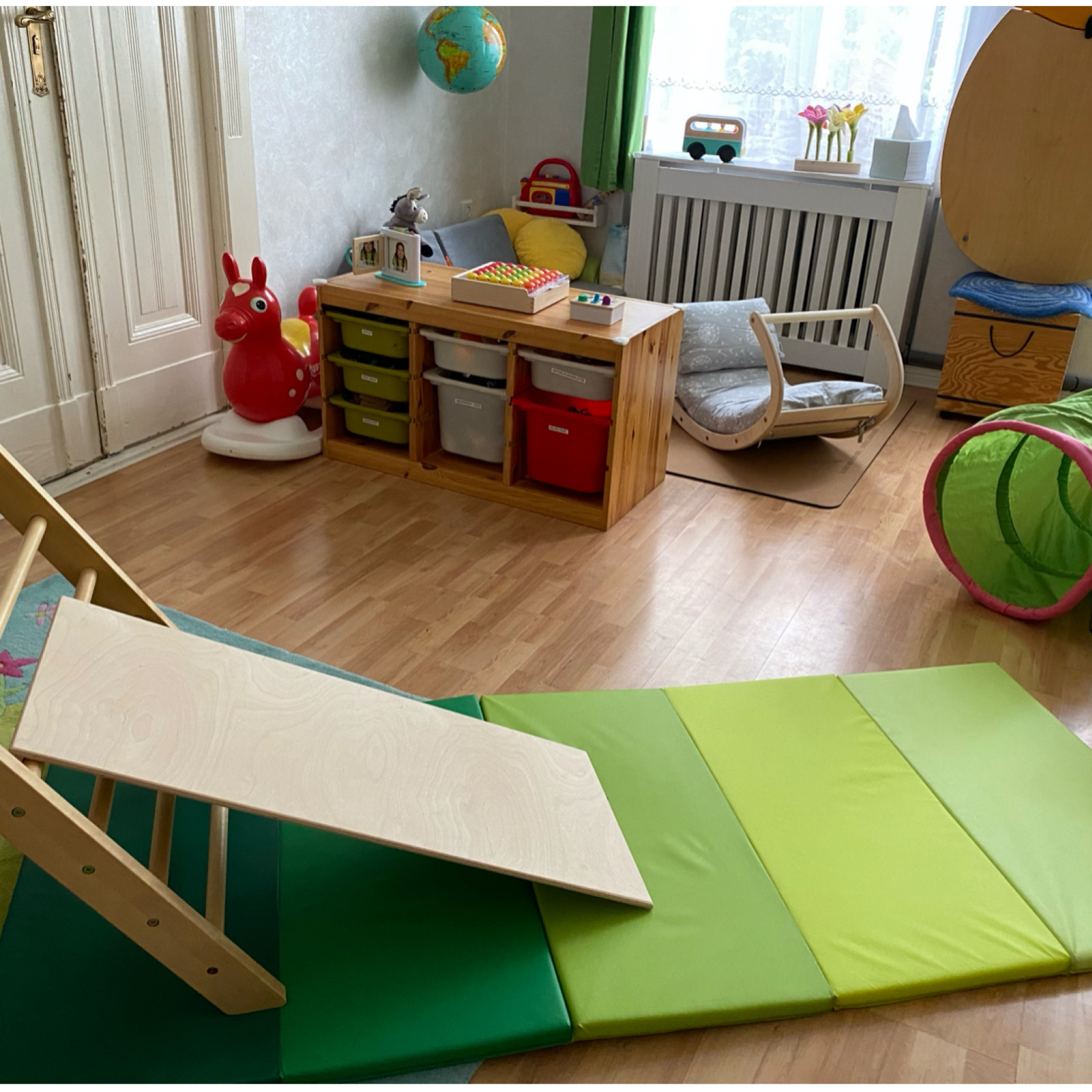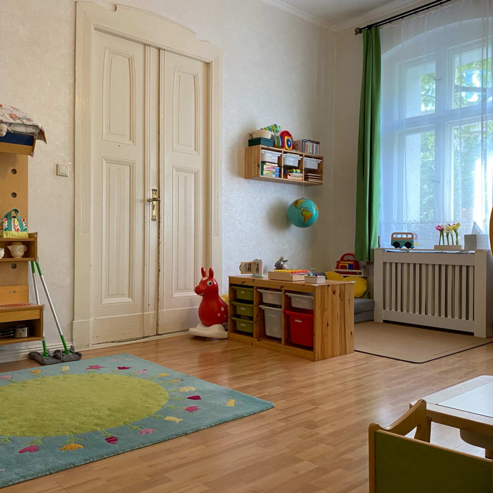 In unserer gemieteten Altbauwohnung haben die drei Kinder ausreichend Platz im eigens eingerichteten Spielzimmer und wenn der Flur ins Spiel einbezogen wird, erweitert er die Spielfläche.